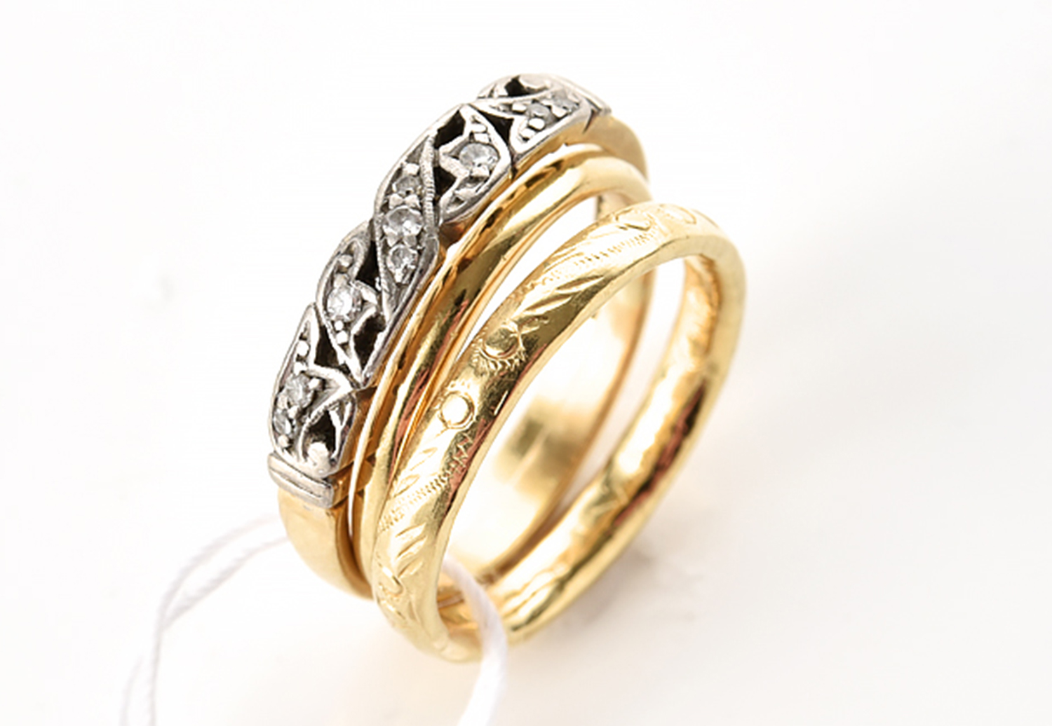 A DIAMOND SET BAND IN PLATINUM AND 18CT GOLD (SIZE M), TOGETHER WITH TWO WEDDERS IN 18CT GOLD (SIZE H-I), 6.4G