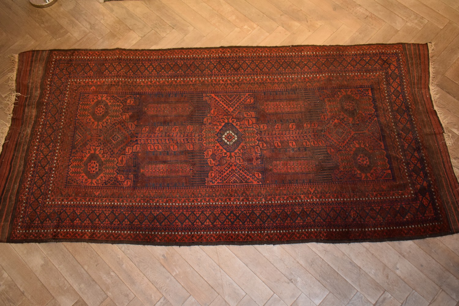 AN ANTIQUE 100% WOOL BALOUCH RUG WITH LOW PILE IN TRADITIONAL DESIGN IN TONES OF RED AND BLUE (400 X 190 CM)