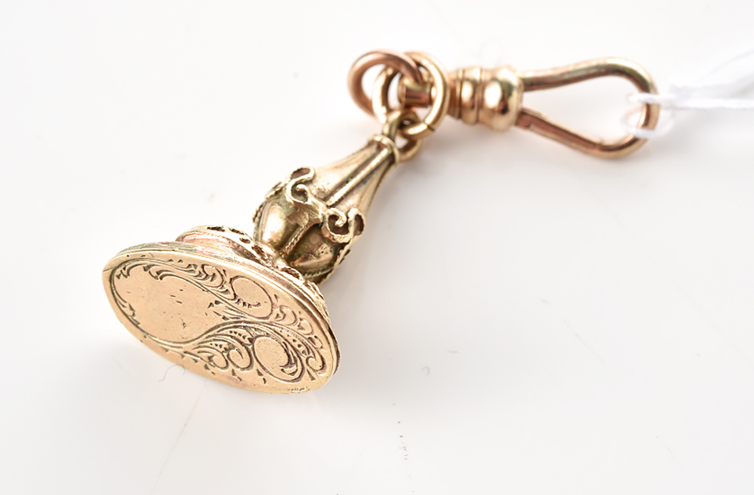 AN ANTIQUE SEAL ON A CARBINE CLASP, IN 9CT GOLD, 8.3GMS