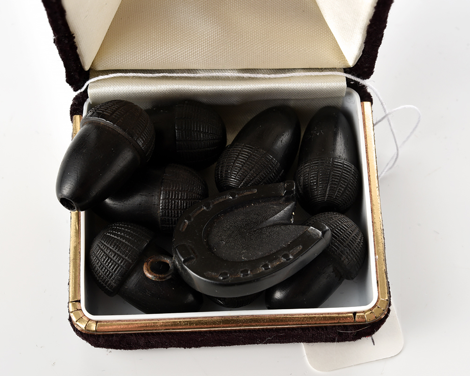 A VICTORIAN JET HORSESHOE PENDANT TOGETHER WITH A COLLECTION OF JET ACORN BEADS