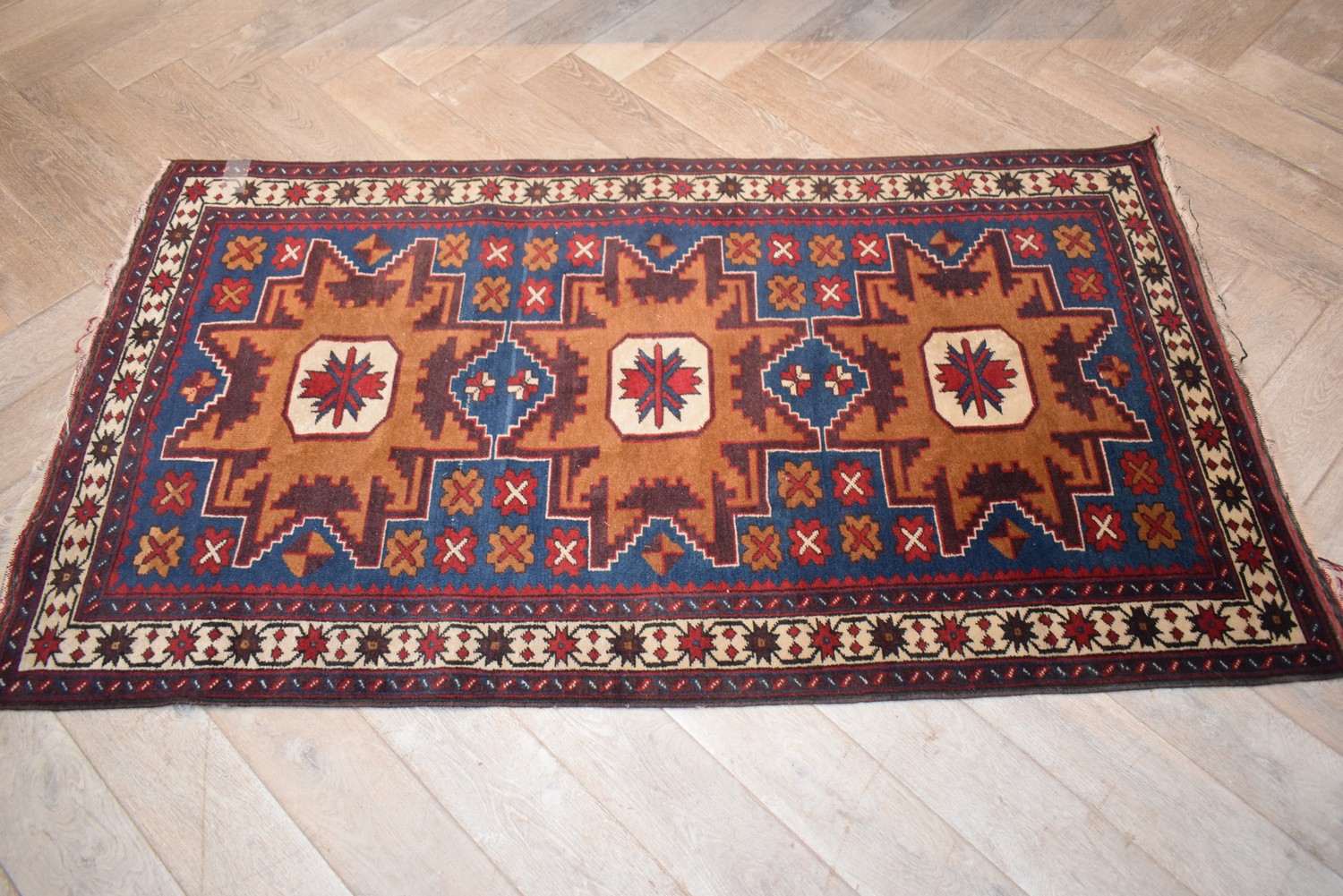 A HANDMADE RUG IN TONES OF BROWN, BLUE AND RED (A/F) (200 X 110 CM)