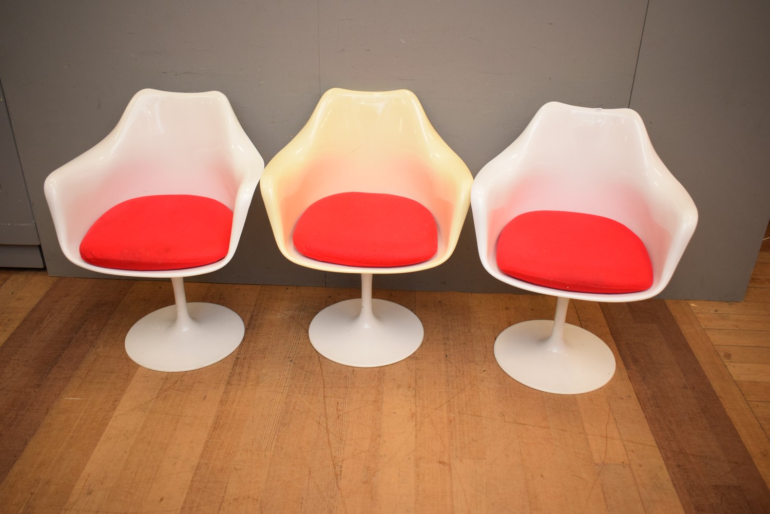 THREE TULIP STYLE CHAIRS (A/F) (85H X 68W X 58D CM)