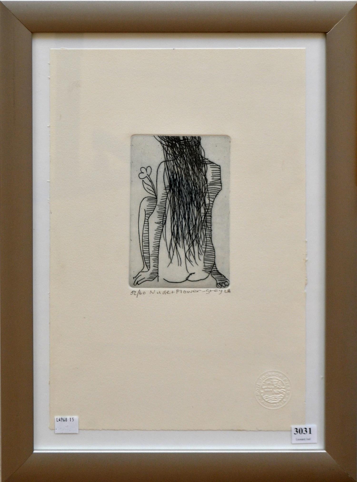 CHARLES BLACKMAN, NUDE + FLOWER - GREY, ETCHING 52/60, 15 X 10CM, FRAME SIZE: 47 X 35CM, CONDITION: VERY GOOD