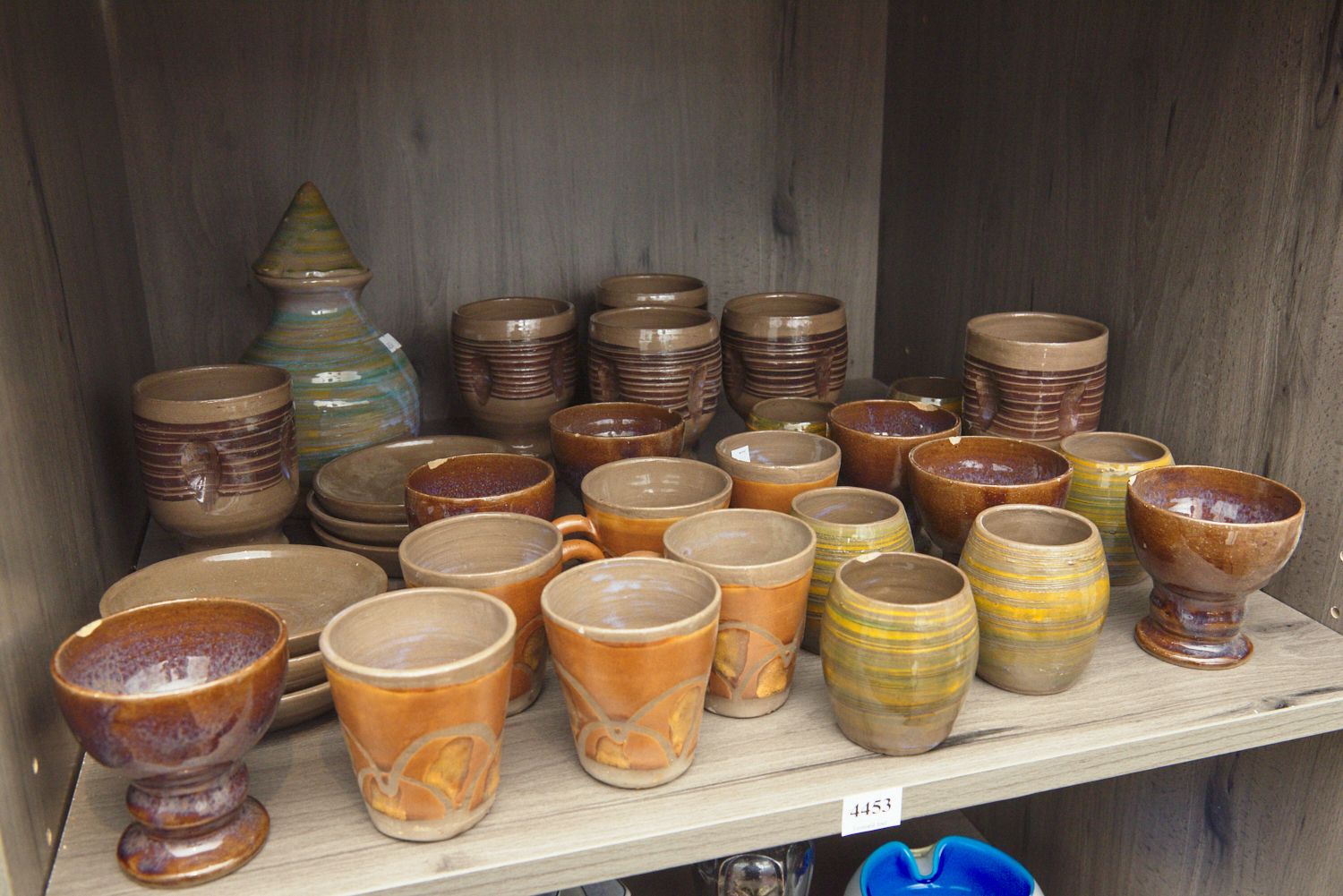 A COMPREHENSIVE COLLECTION OF DYSON POTTERY GLAZED EARTHENWARE ARTICLES, INCLUDING A LIDDED VASE, CUPS, GOBLETS AND SAUCERS, (SOME LOSSES)