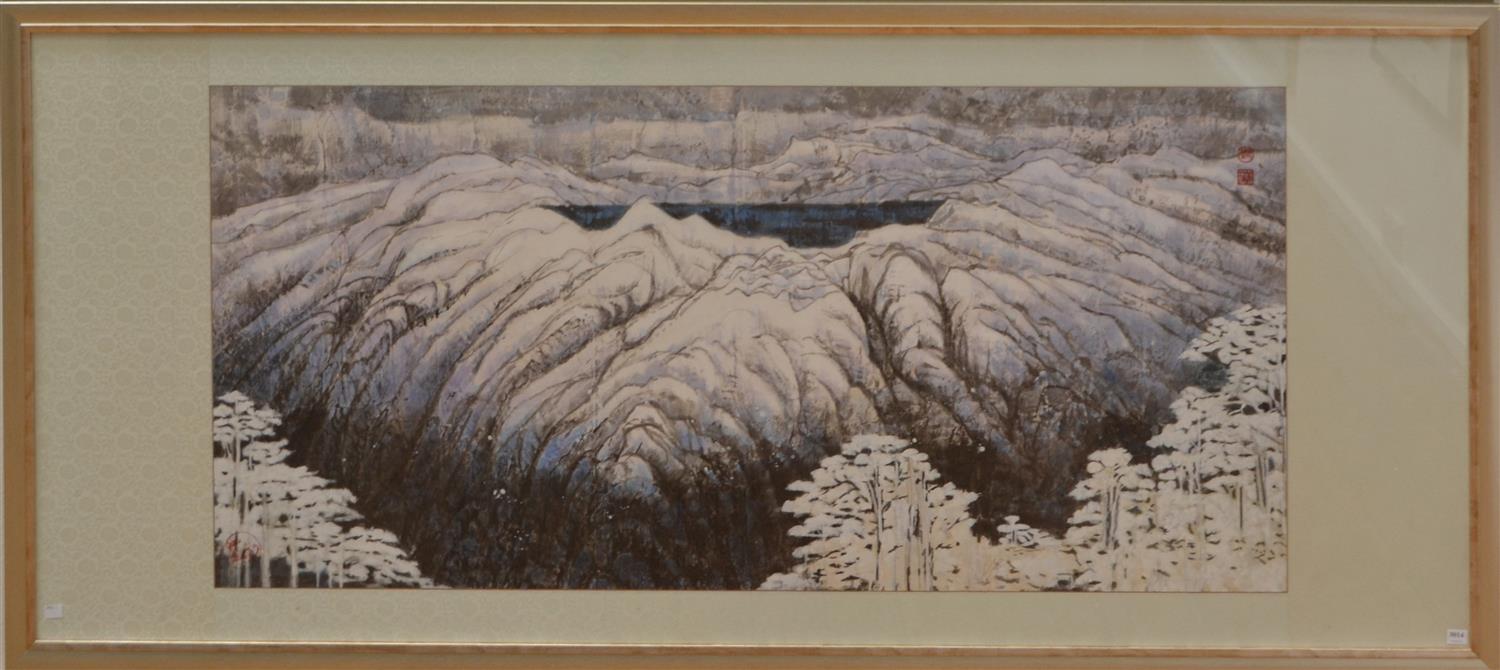 LILIAN TANG, LANDSCAPE, WATERCOLOUR ON RICE PAPER, 62 X 135CM, FRAME SIZE: 84 X 188CM, CONDITION: GOOD, LEONARD JOEL DELIVIERY SIZE: LARGE