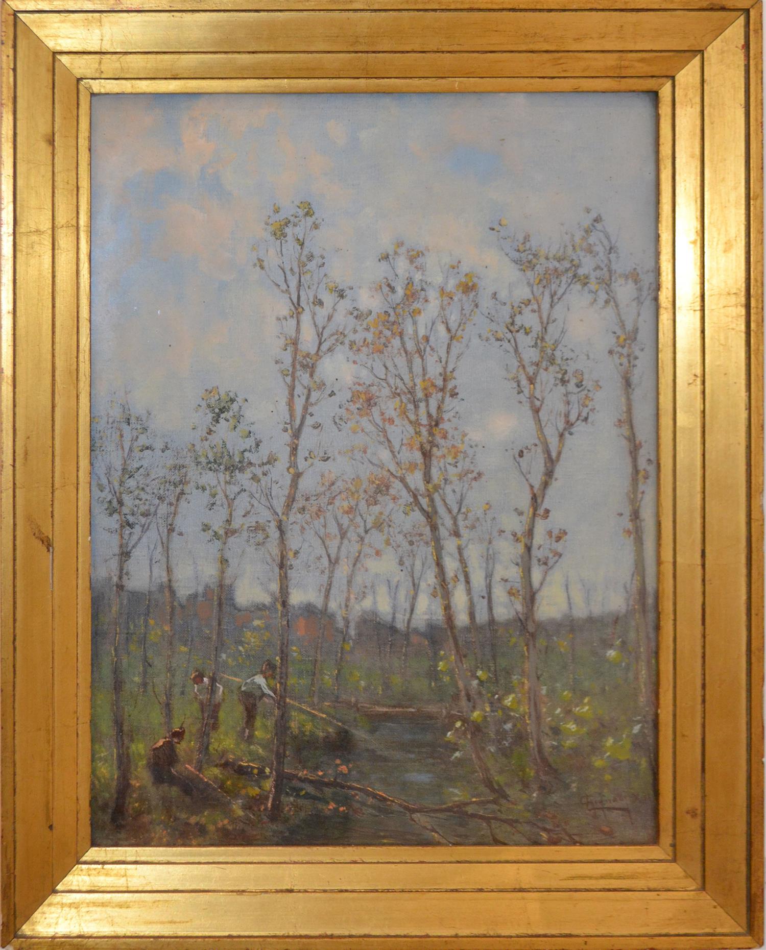 ARTIST UNKNOWN, BY THE STREAM, OIL ON CANVAS, 42 X 31CM, FRAME SIZE: 52 X 41.5CM, CONDITION: VERY GOOD, CHIP TO FRAME