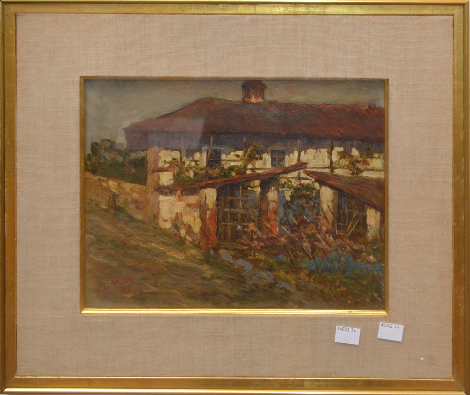 ARTIST UNKNOWN, SIGNED LOWER LEFT: C. MAY, COUNTRY HOUSE 1924, OIL ON PANEL, 22 X 28CM, FRAME SIZE: 38.5 X 45CM, CONDITION: DISCOLOURATION