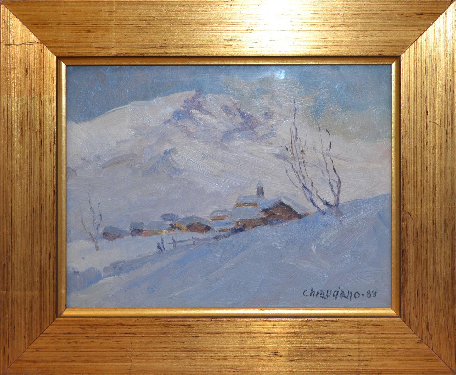 BEPPE CHIQUDANO (ITALIAN SCHOOL), SNOWSCAPE 1983, OIL ON BOARD, 18 X 23CM, FRAME SIZE: 26.5 X 32CM, CONDITION: SURFACE DISCOLOURATION, WELL FRAMED