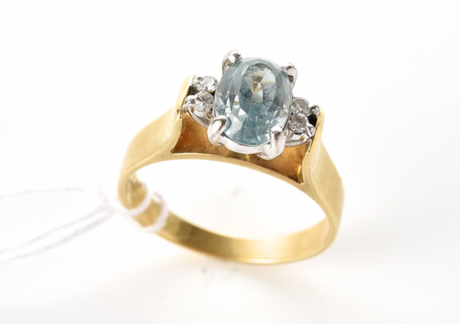 AN AQUAMARINE AND DIAMOND RING IN 18CT GOLD AND PLATINUM, SIZE N-O, 4.8GMS