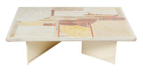 There are significant scratches to the painted cream metal base, although not visible when the top is on. Stone top in lovely condition, no cracks or stains. Signature to top. A lovely piece.