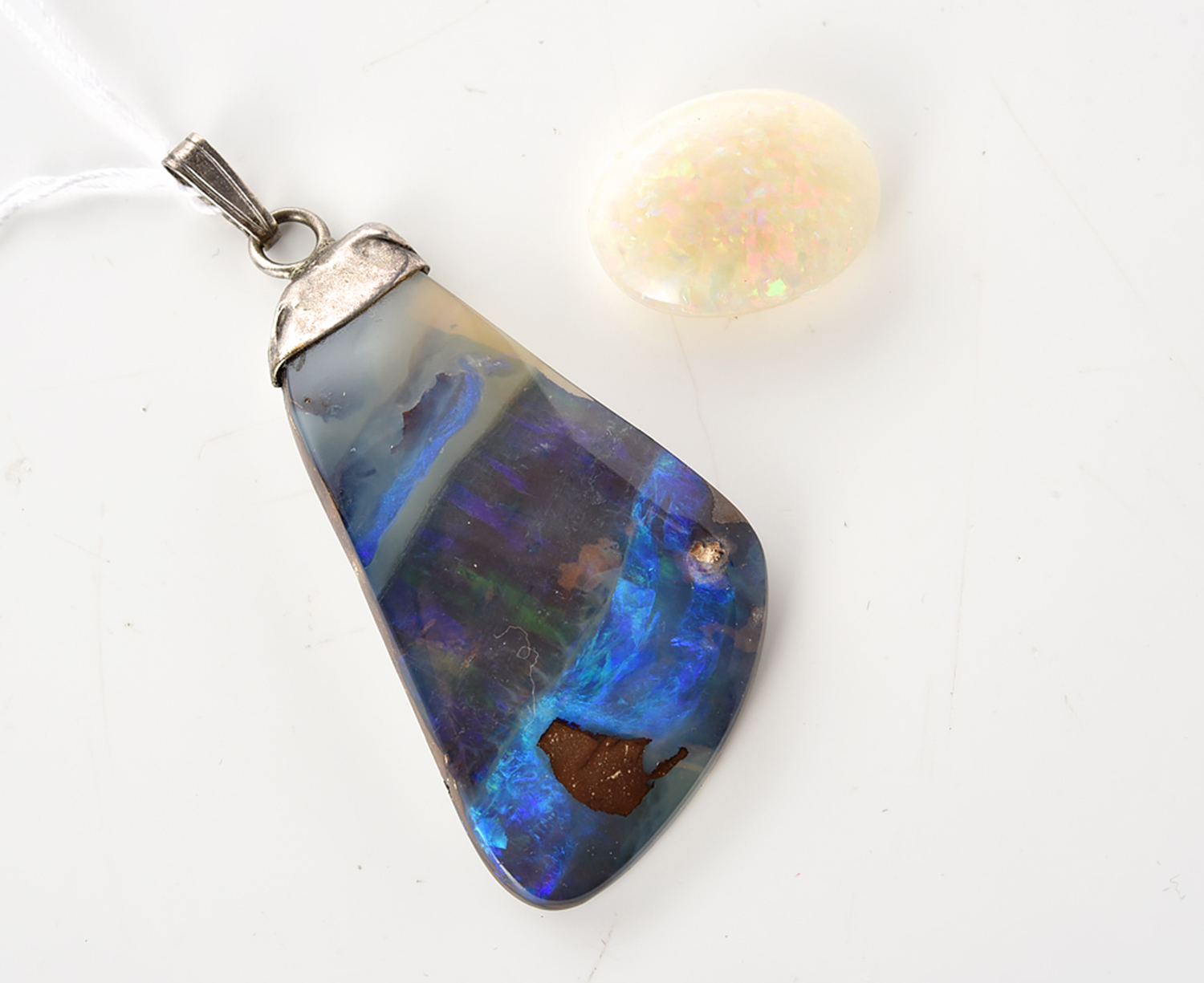 A BLACK OPAL PENDANT IN SILVER (TOTAL LENGTH 60MM) AND A LOOSE WHITE OPAL (19.60x15.60x6.80MM), BOXED