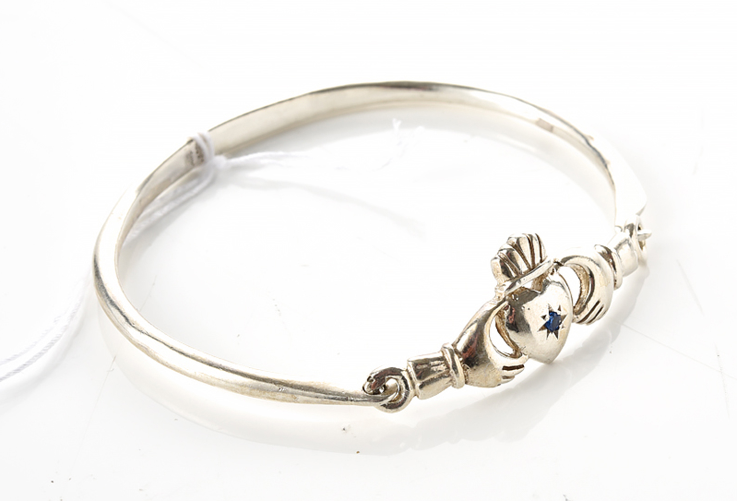 A CLADDAGH BANGLE SET WITH A BLUE PASTE IN SILVER, INNER DIAMETER 57MM