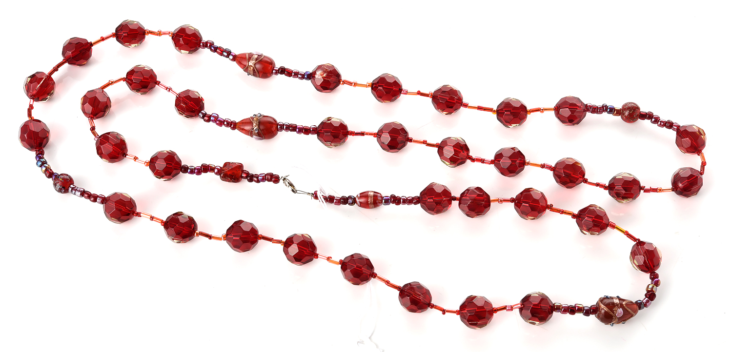 A VINTAGE RED GLASS BEAD AND MURANO BEAD LONG NECKLACE, TOTAL LENGTH 118CM