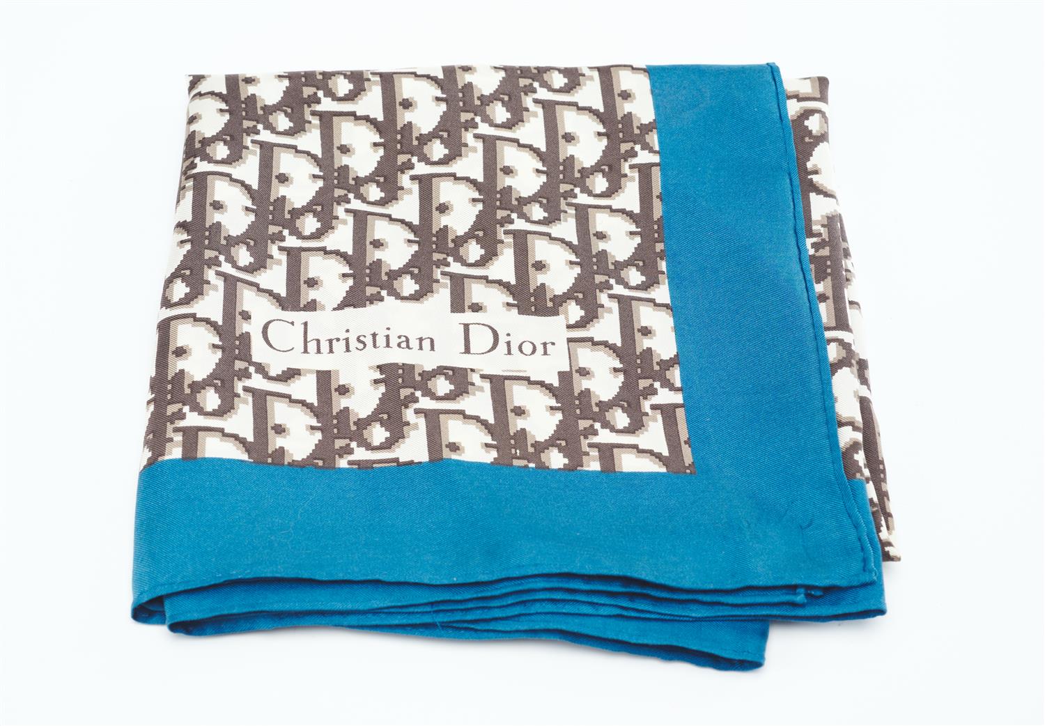 Styled with Dior design in beige and brown with teal green border, 90cm square.