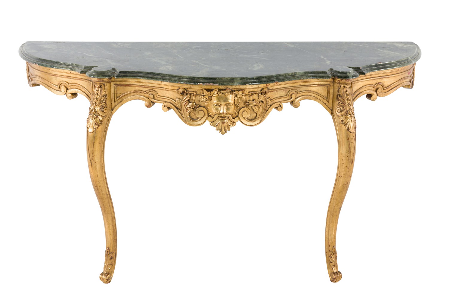 Of serpentine form, the green toned faux marble top, above a frieze and carved apron with central Bacchanalian mask, flanked with acanthus scrolls, standing on two serpentine legs (split to wood on right hand leg with associated damage to apron on right side)