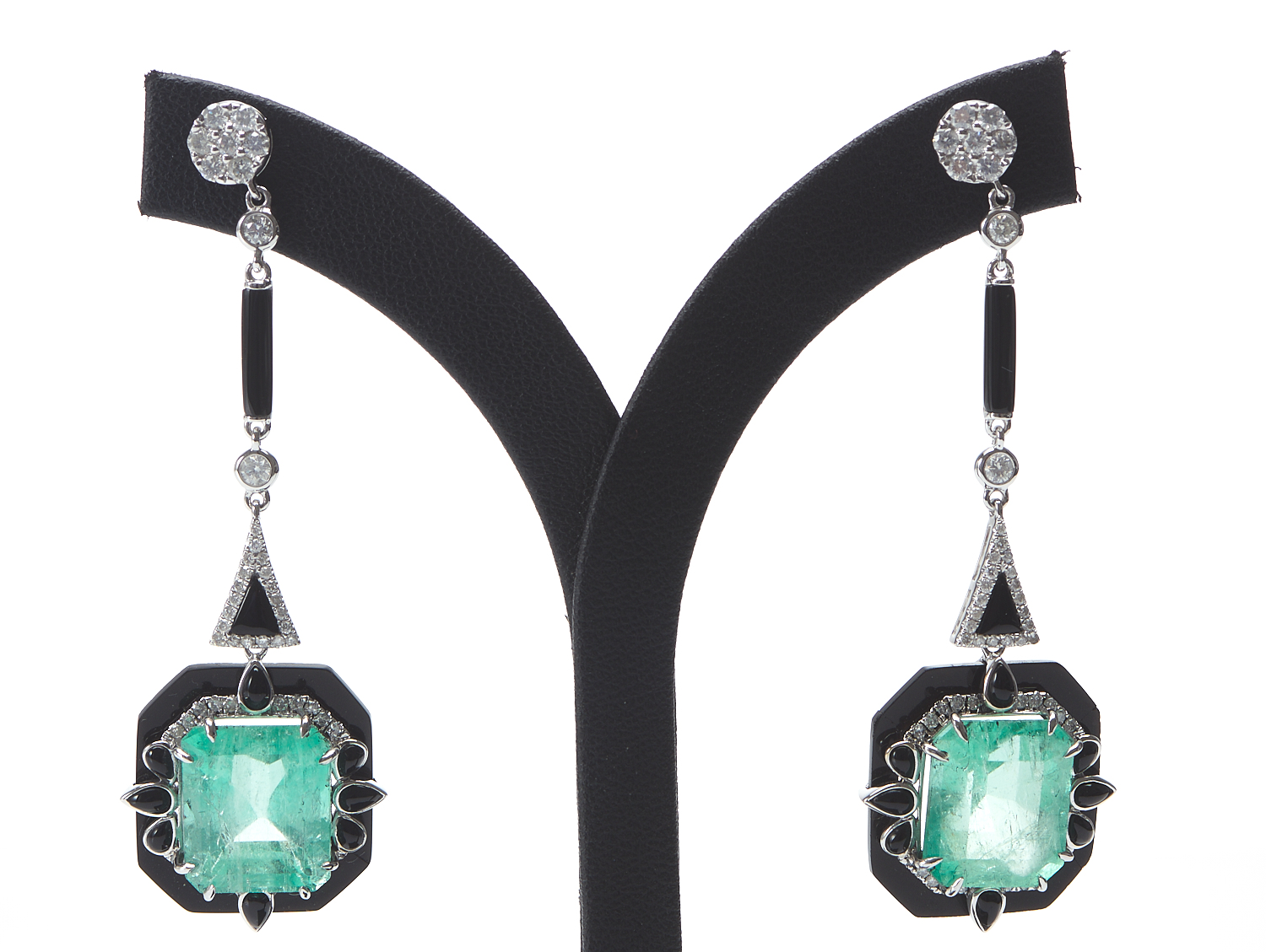 A PAIR OF ART DECO STYLE DROP EARRINGS IN 18CT WHITE GOLD, SET WITH EMERALD, ONYX AND DIAMOND, THE EMERALDS TOTALLING 19.34CTS AND DIAMONDS TOTALLING 1.08CTS, TO POST AND BUTTERFLY FITTINGS, LENGTH 65MM, 12.8GMS
