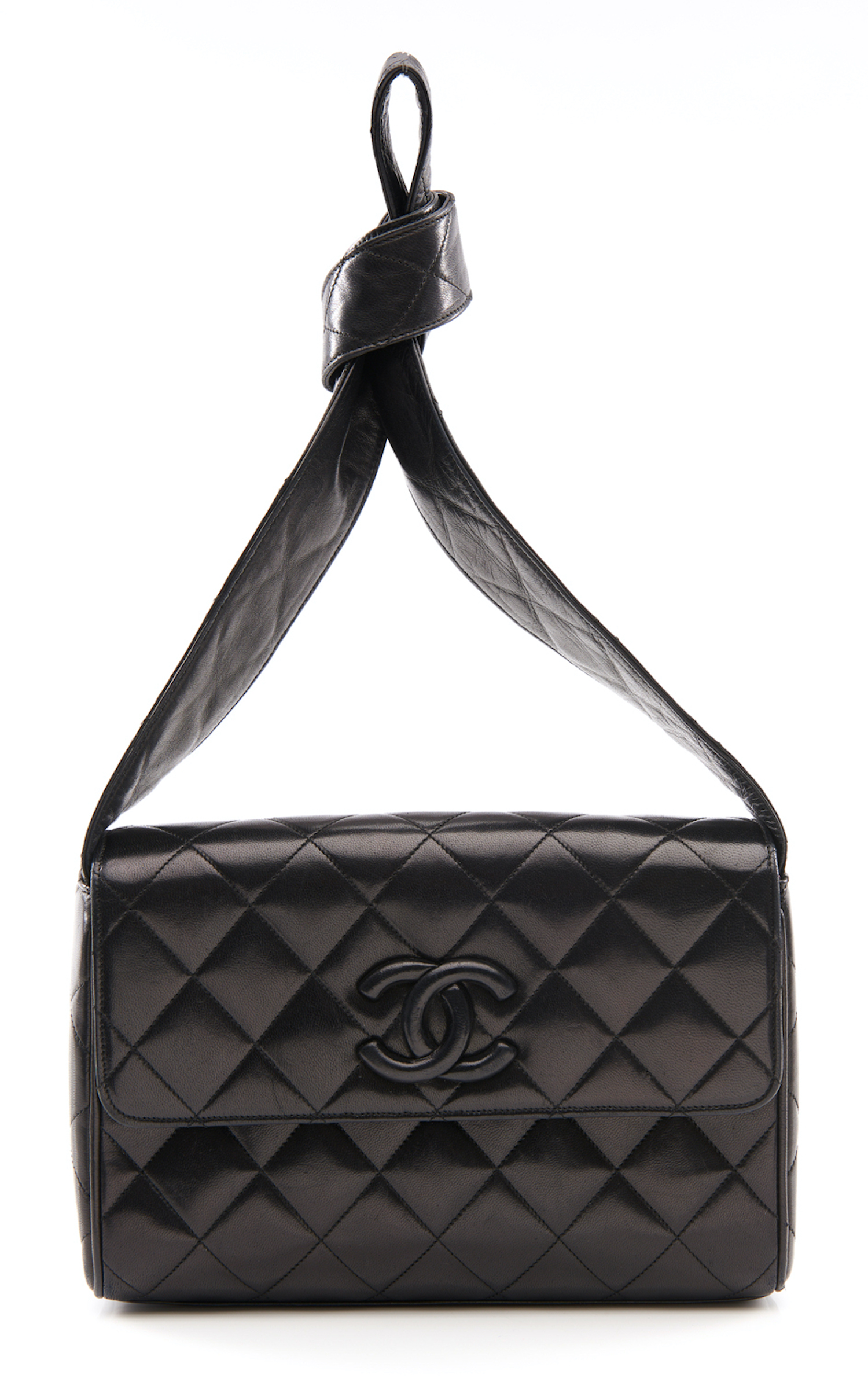 Styled in quilted black calfskin leather with conforming shoulder strap and gold metal hardware, 16 x 23 x 5cm.