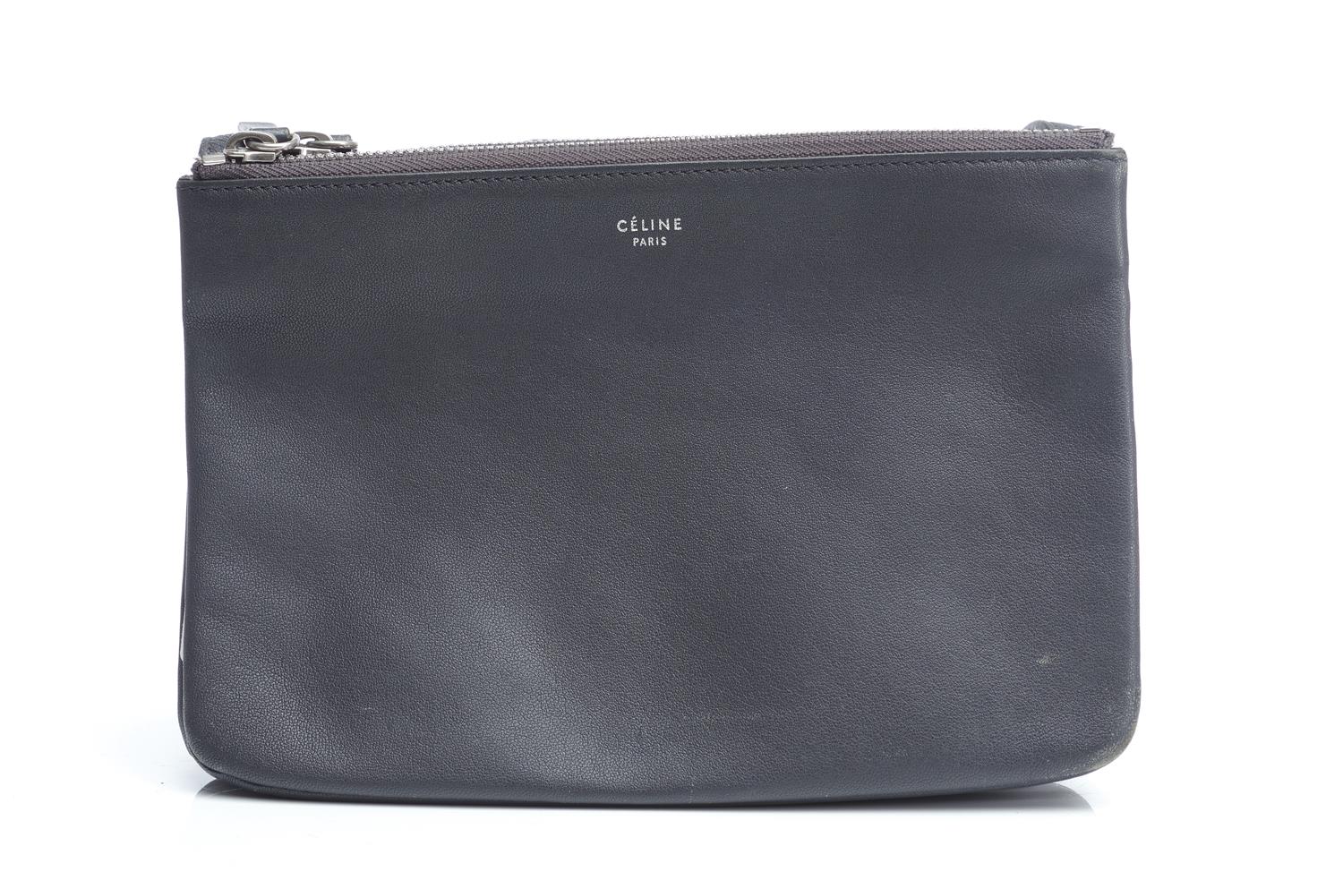 Styled in grey leather with silver metal triple zip opening and shoulder strap, 22 x 14 x 3cm.