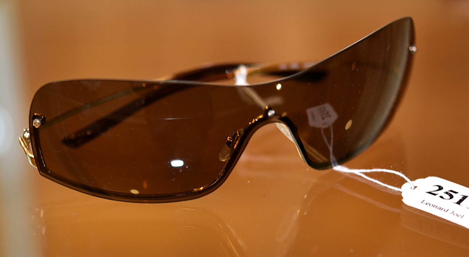 A PAIR OF VINTAGE SUNGLASSES BY GUCCI- Styled with a single lens with gold metal frame.
