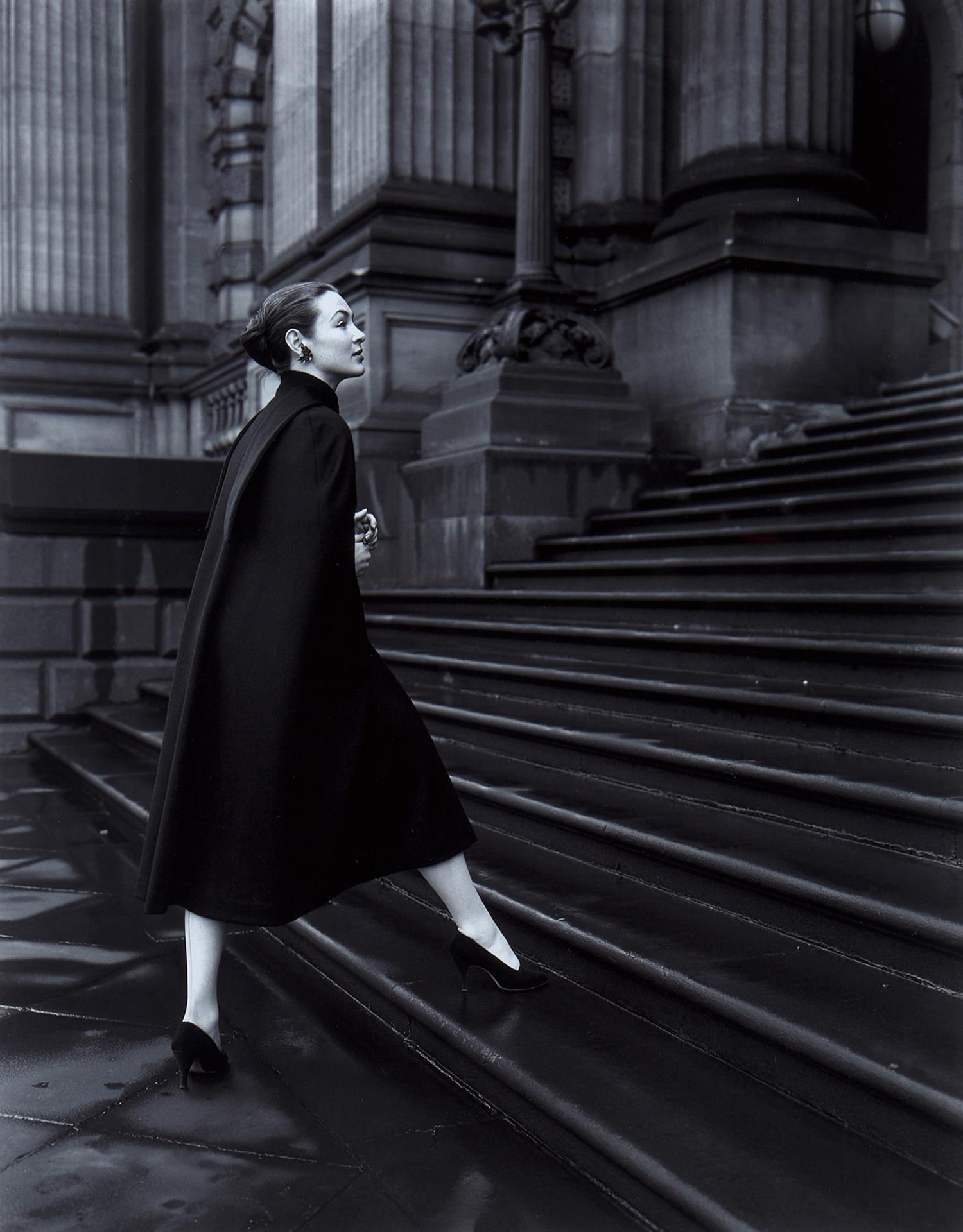 Helen Homewood wears a black wool cape by 'Phillipa Fashions' for The Australian Wool Board, photographed on Parliment Steps Melbourne 1959