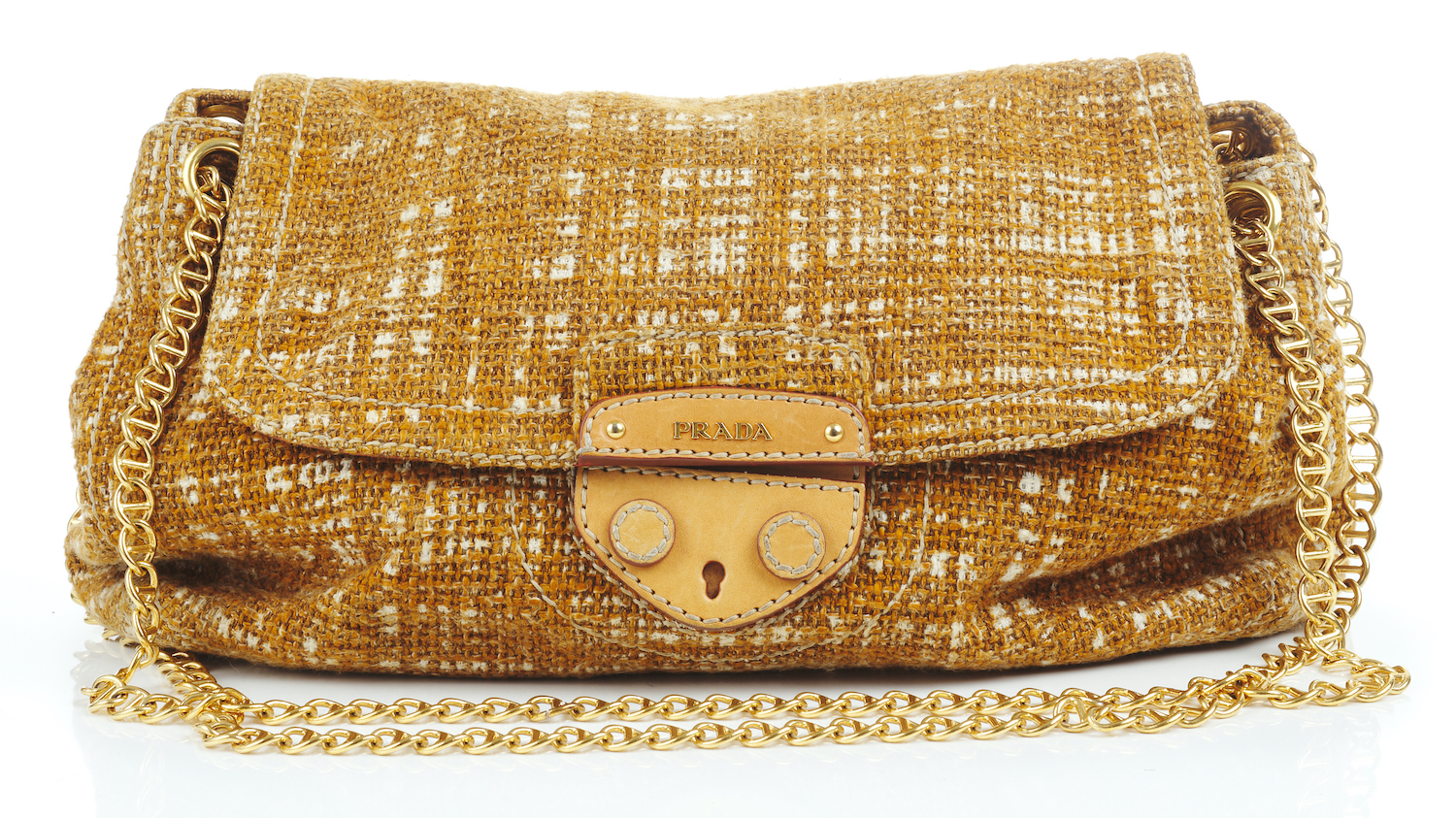 Styled in camel and beige tweed with gold metal hardware and conforming chain shoulder strap, 34 x 24 x 10cm.
