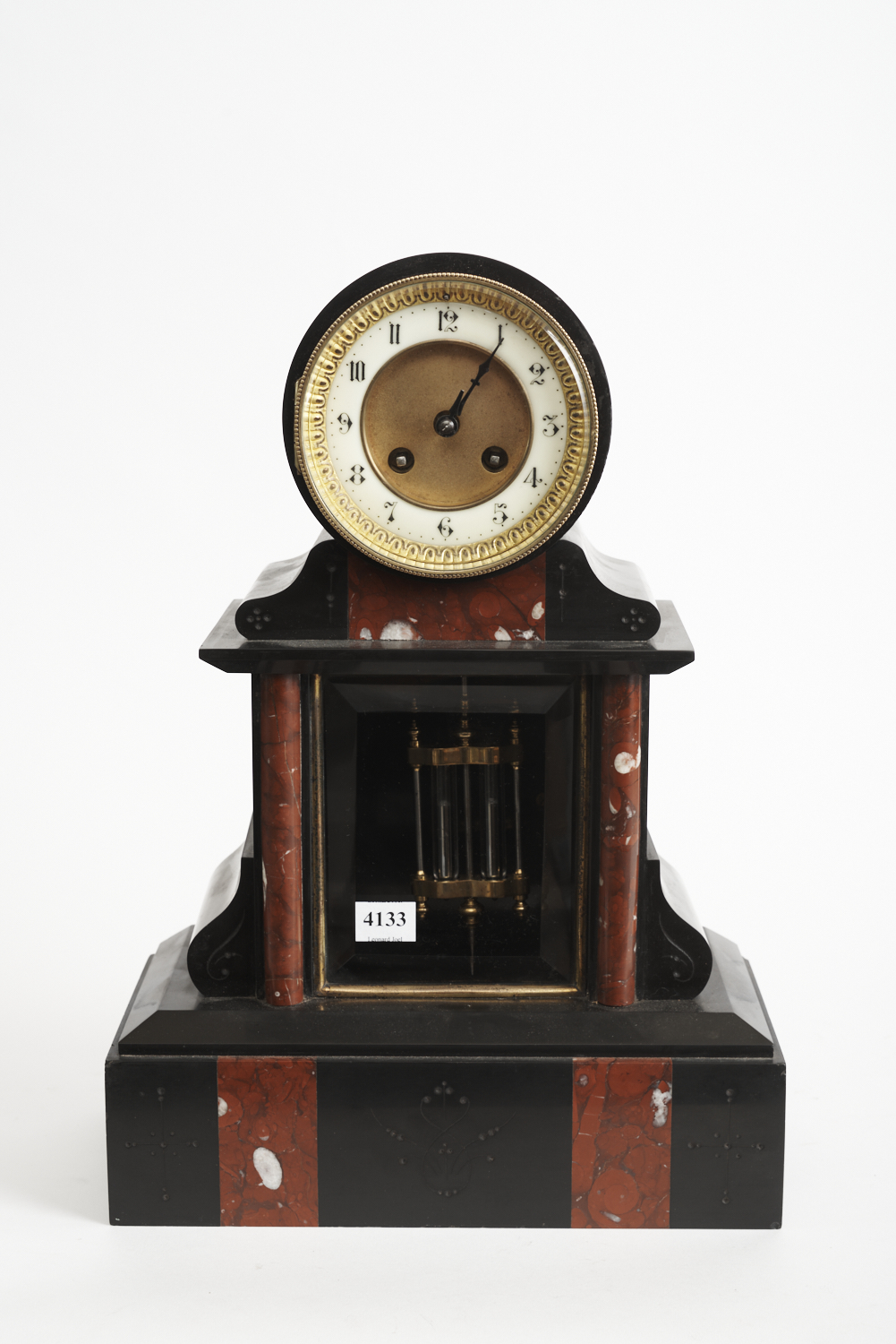 The circular enamel dial with a gilded border, above a glazed bevelled panel, housing a mercury pendulum, encased in rouge and black marble.