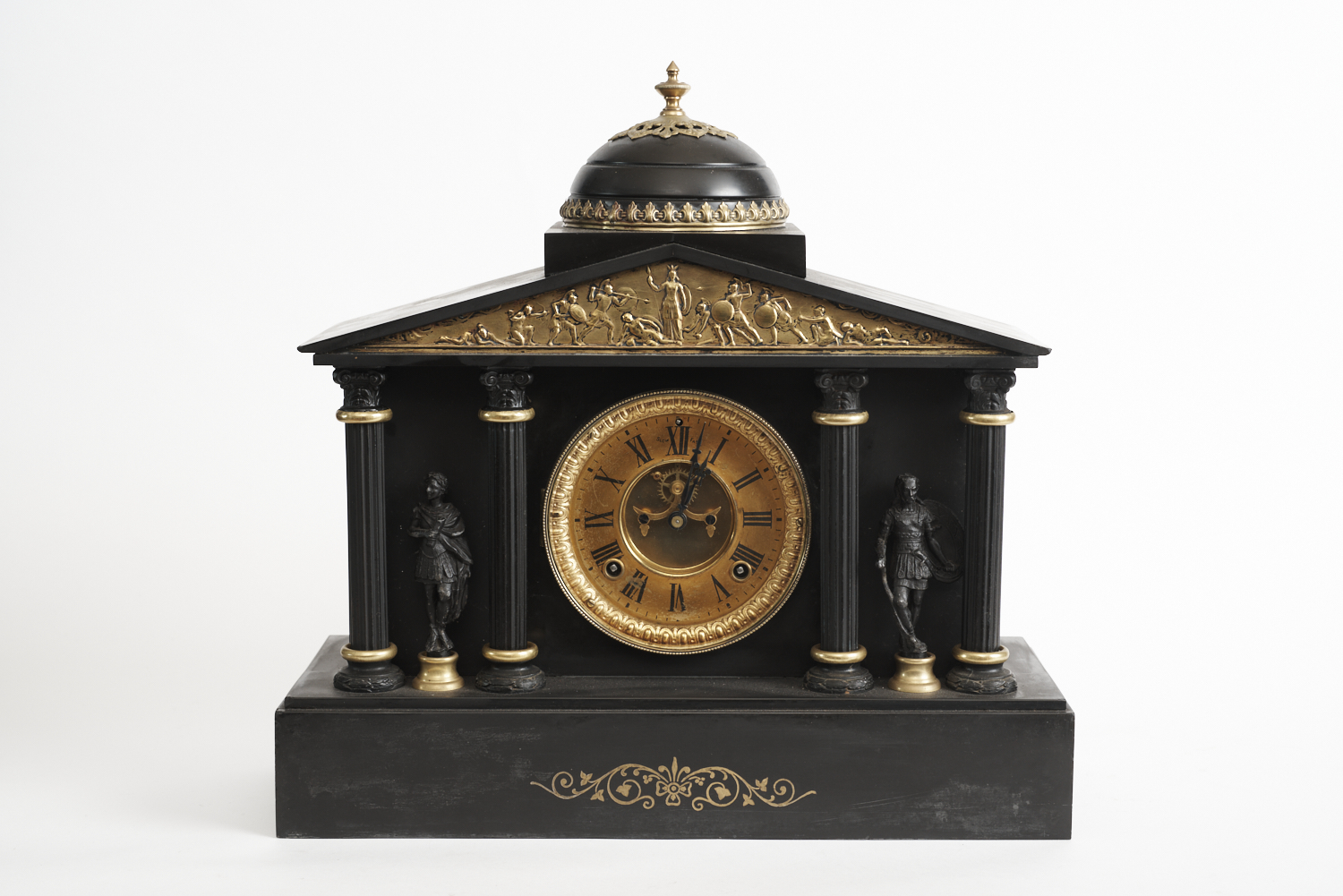 The architecturally inspired mantel clock with a cuppola finial, inset with a classical frieze and adorned with two warriors flanking the circular dial.