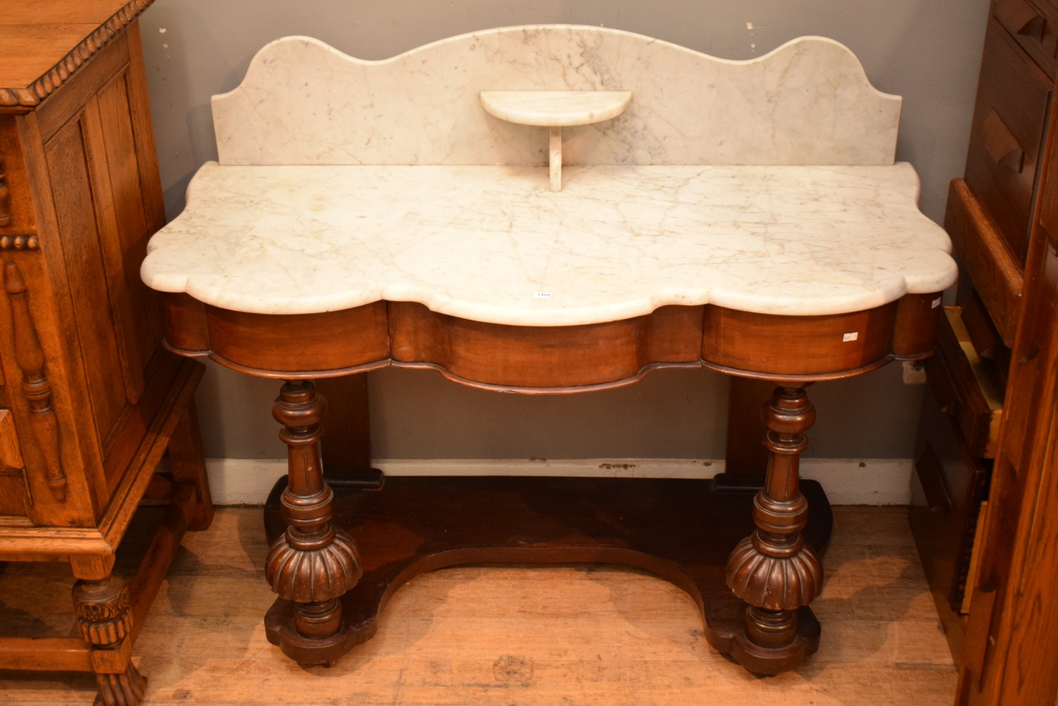 A FINE VICTORIAN MARBLE TOP MAHOGANY WASH STAND (97H X 121W X 55D CM) (A/F) (PLEASE NOTE THIS HEAVY ITEM MUST BE REMOVED BY CLIENTS OR CARRIERS AT THE CUSTOMERS EXPENSE. LEONARD JOEL STAFF CANNOT ASSIST CARRYING THIS ITEM)