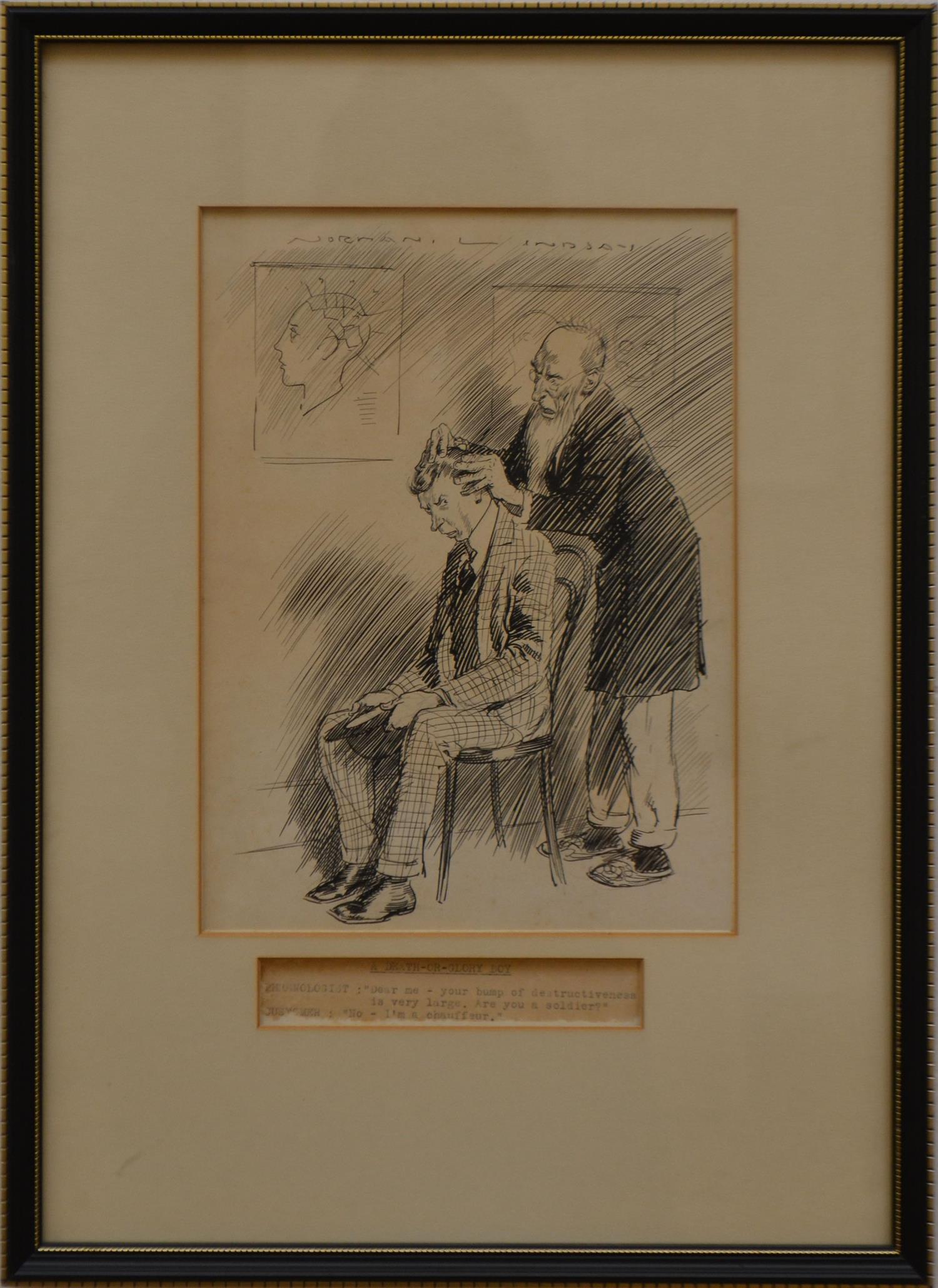 NORMAN LINDSAY, A DEATH -OR- GLORY BOY, INK ON PAPER, 26 X 19.5CM, FRAME SIZE: 45 X 33CM, CONDITION: GOOD, WITH YELLOWING A LIGHT FOXING FOXING LOWER AREA. LEONARD JOEL DELIVERY SIZE: SMALL