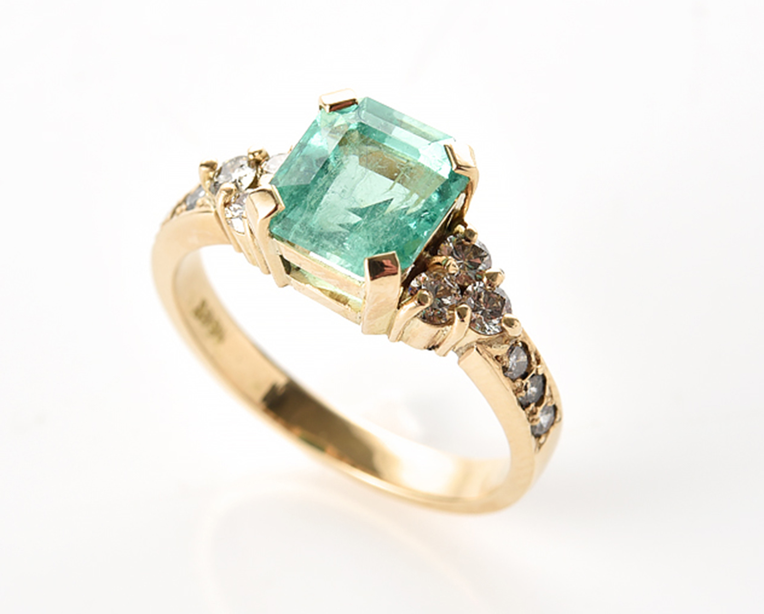 A COLOMBIAN EMERALD AND DIAMOND RING, EMERALD WEIGHING 2.27CTS, DIAMONDS TOTALLING 0.40CTS IN 18CT GOLD, RING SIZE P, 5.3GMS