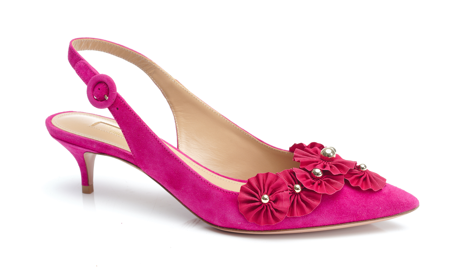 Styled in hot pink suede with grosgrain and gilt bead detail, labelled size 38, boxed.
