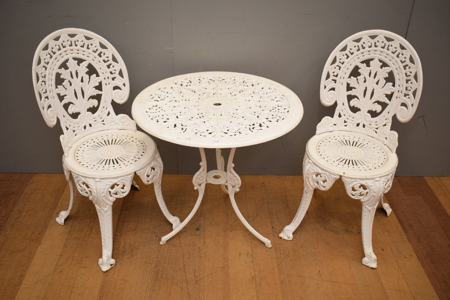 A THREE PIECE CAST IRON OUTDOOR SETTING (A/F) (TABLE 67H X 70D CM)