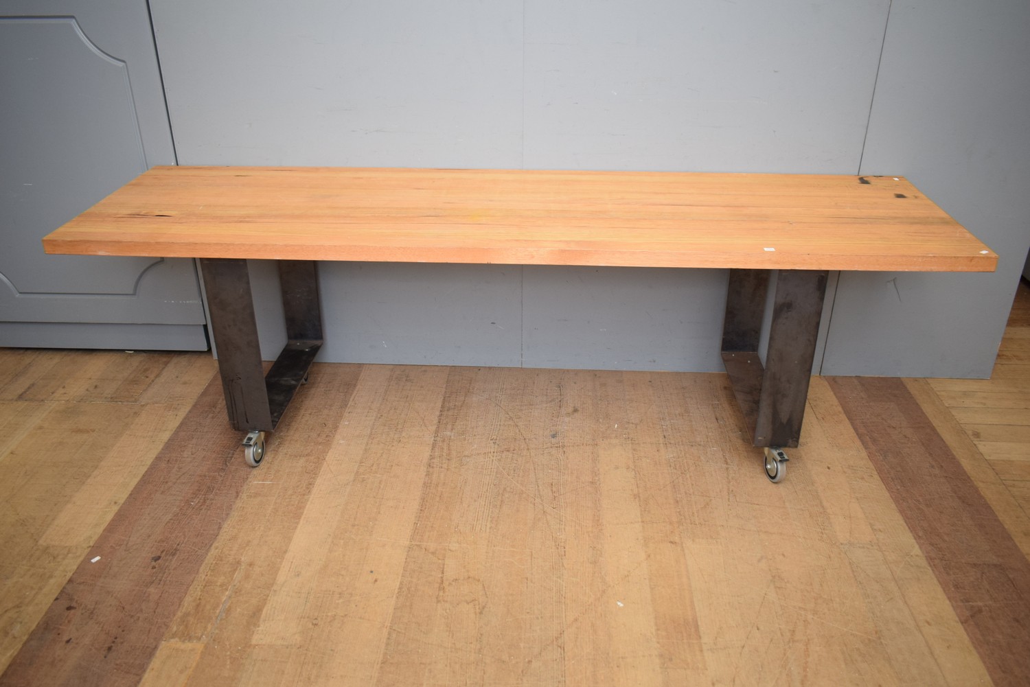 A SUBSTANTIAL TIMBER BENCH ON CASTORS (77H X 250W X 72D CM) (PLEASE NOTE THIS HEAVY ITEM MUST BE REMOVED BY CLIENTS OR CARRIERS AT THE CUSTOMERS EXPENSE. LEONARD JOEL STAFF CANNOT ASSIST CARRYING THIS ITEM)