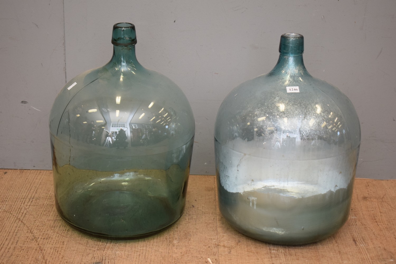 TWO SMALL GLASS DEMIJOHNS (A/F) (48 CM H)