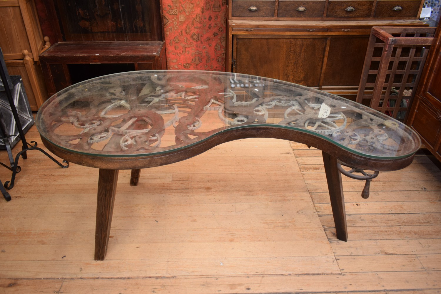 AN INDUSTRIAL TABLE WITH WORKING GEARS (75H X 170W X 94D CM) (PLEASE NOTE THIS HEAVY ITEM MUST BE REMOVED BY CLIENTS OR CARRIERS AT THE CUSTOMERS EXPENSE. LEONARD JOEL STAFF CANNOT ASSIST CARRYING THIS ITEM)