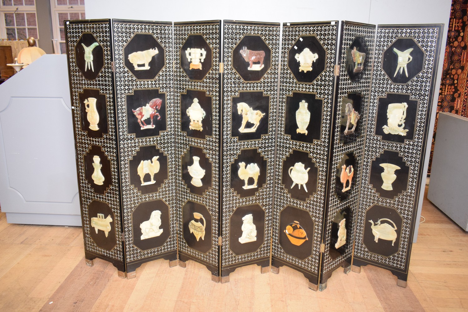 A SEVEN PANEL CHINESE SCREEN (A/F, IN TWO PIECES) (183H X 40W EACH PANEL)