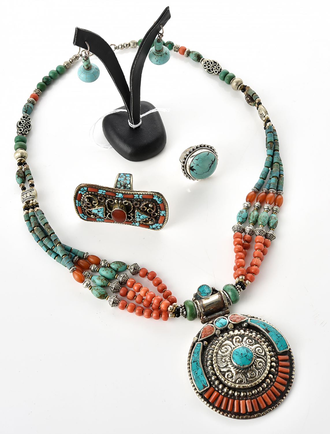 A TURKISH TURQUOISE AND GEM-SET JEWELLERY SET IN SILVER, COMPRISING A NECKLACE (LENGTH 52CM)M A PAIR OF EARRINGS AND TWO RINGS (SIZE M AND U)