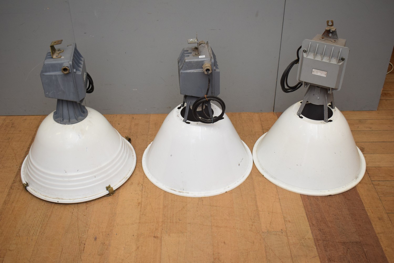 A COLLECTION OF THREE INDUSTRIAL METAL LIGHT FITTINGS (A/F) (62 CM D)