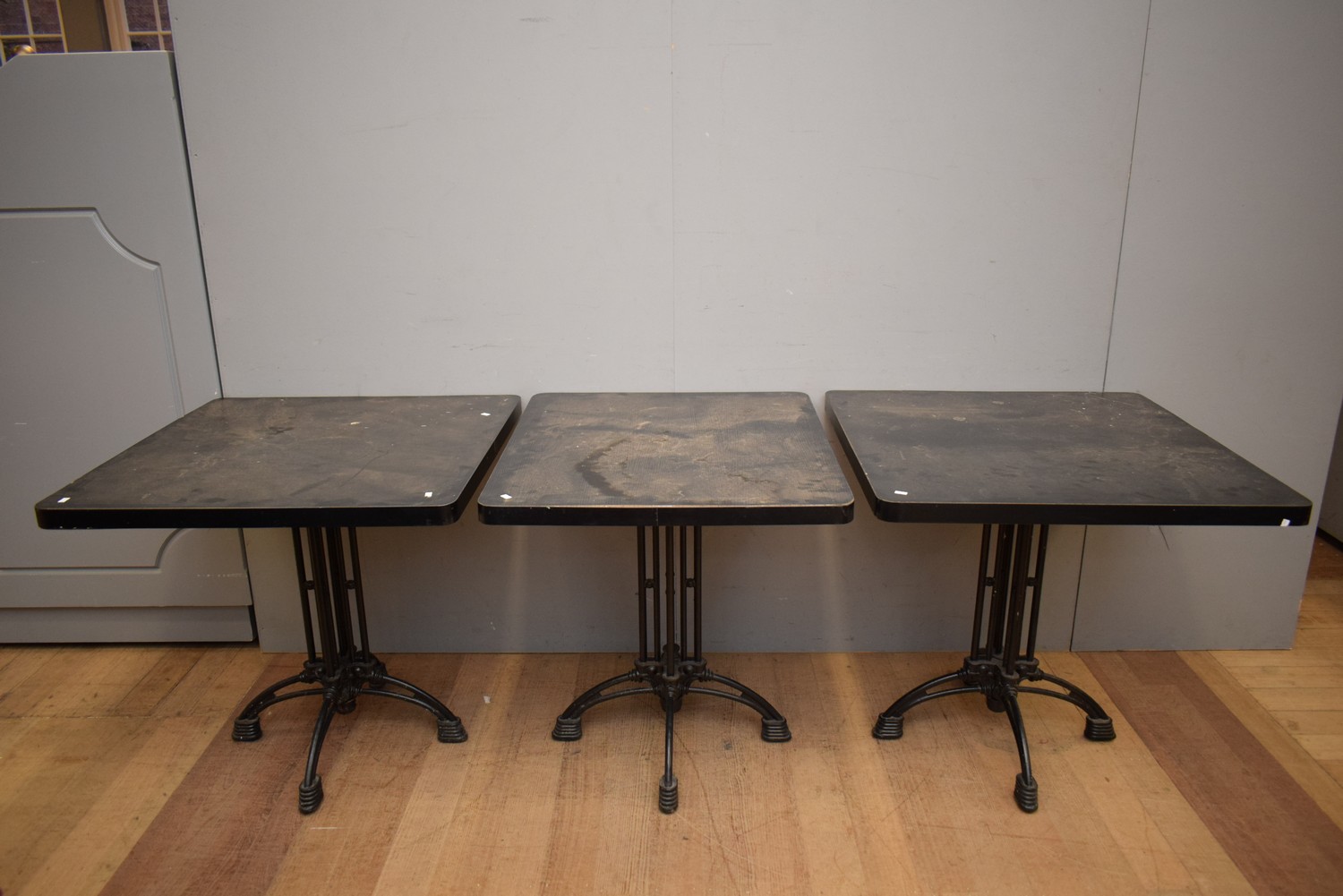 A SET OF THREE CAFE TABLES (A/F, DIFFERING SIZES) (TWO 76H X 81W X 81D CM, ONE 76H X 81W X 71D CM)