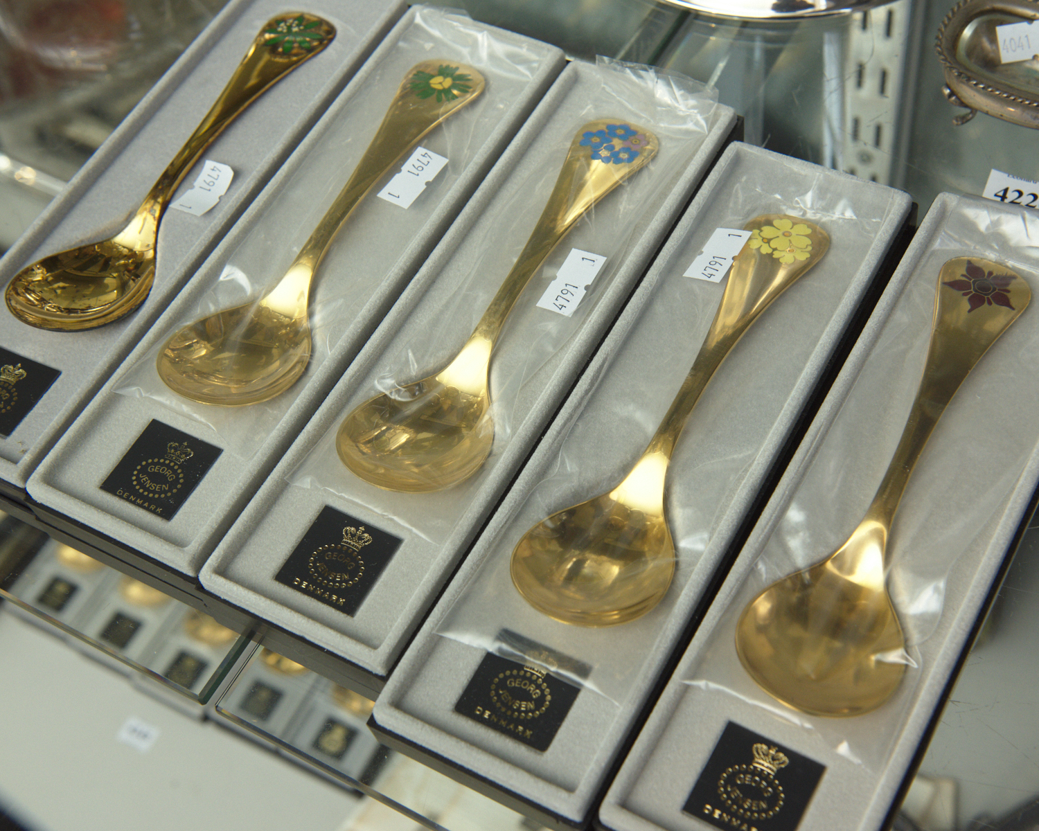 A COLLECTION OF FIVE GEORG JENSEN YEAR SPOONS IN STERLING SILVER GILT WITH FLORAL MOTIFS AND ORIGINAL BOXES, LEONARD JOEL DELIVERY SIZE: SMALL