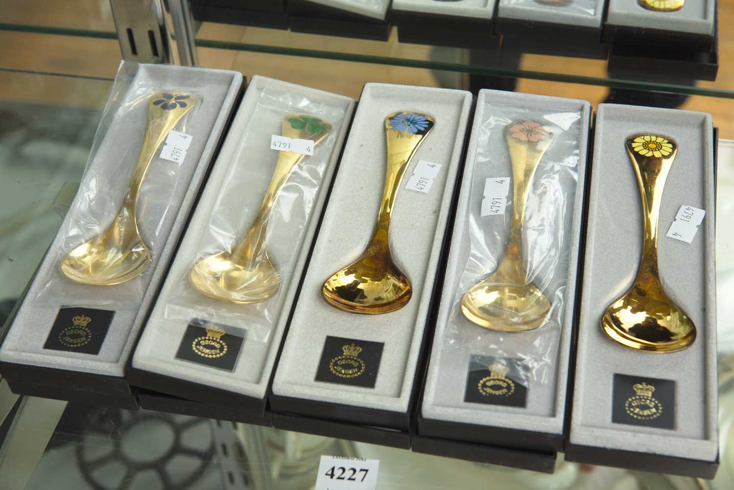 A COLLECTION OF FIVE GEORG JENSEN YEAR SPOONS IN STERLING SILVER GILT WITH FLORAL MOTIFS AND ORIGINAL BOXES