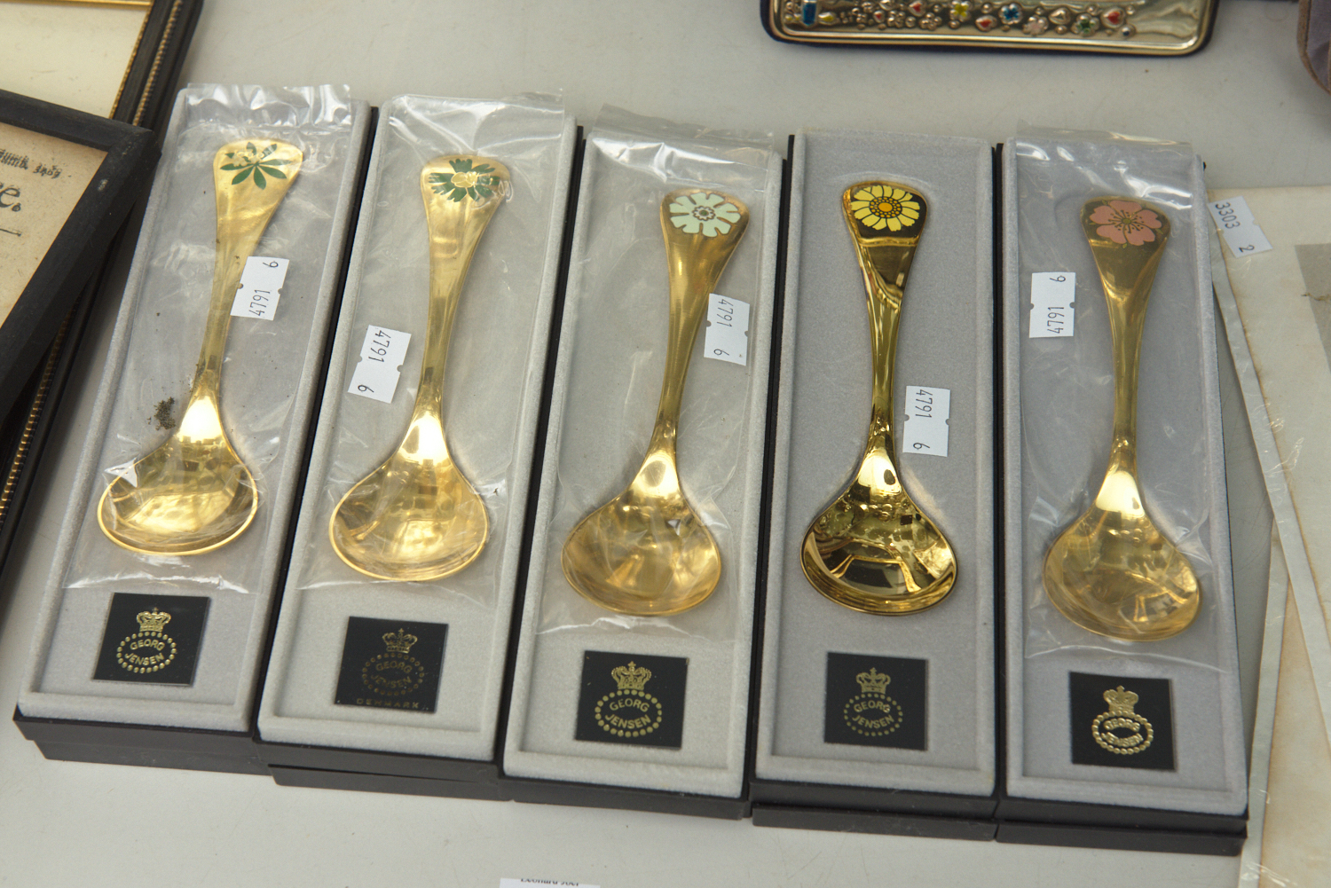 A COLLECTION OF FIVE GEORG JENSEN YEAR SPOONS IN STERLING SILVER GILT WITH FLORAL MOTIFS AND ORIGINAL BOXES