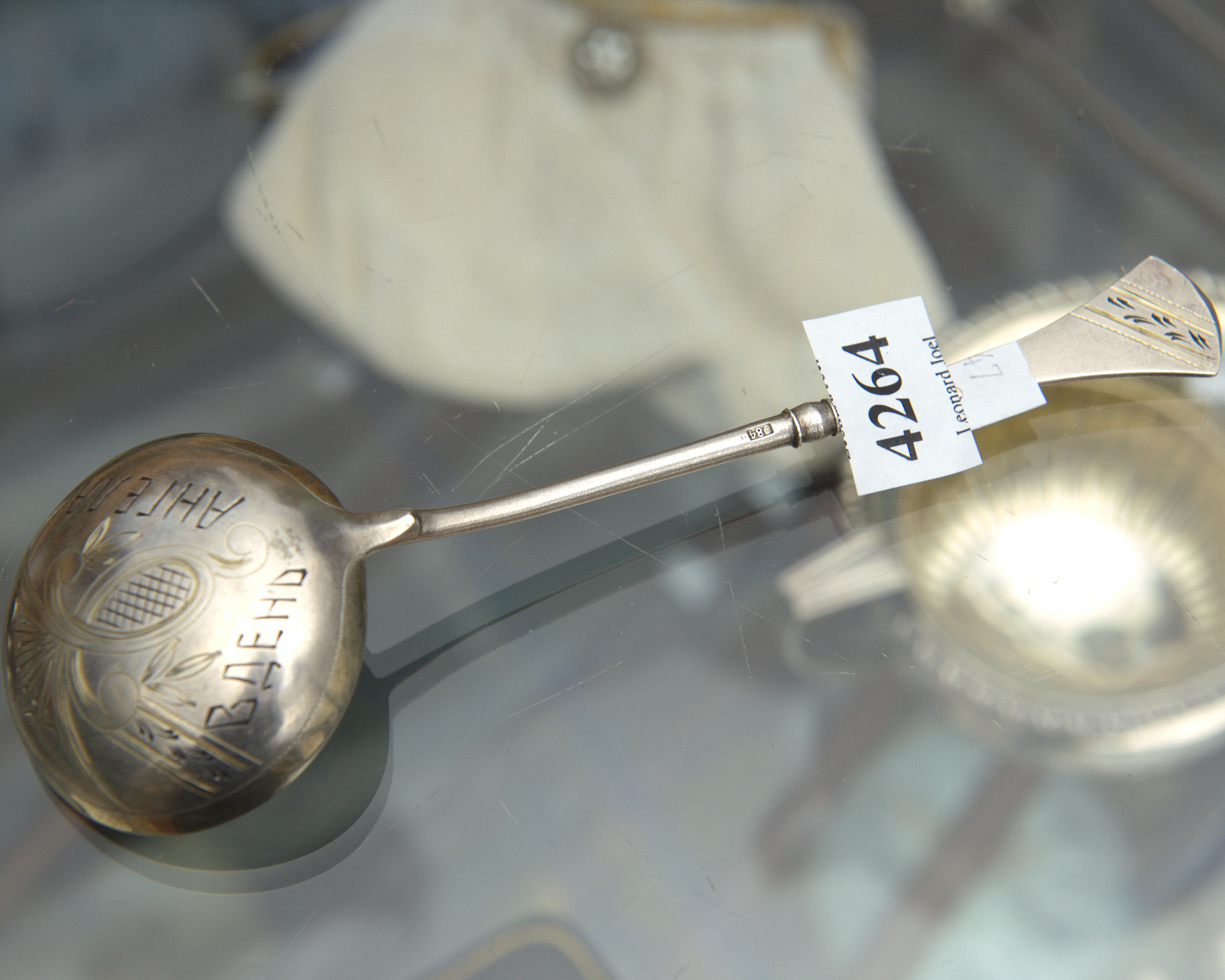 AN ANTIQUE RUSSIAN SILVER SPOON WITH ENGRAVED DECORATION