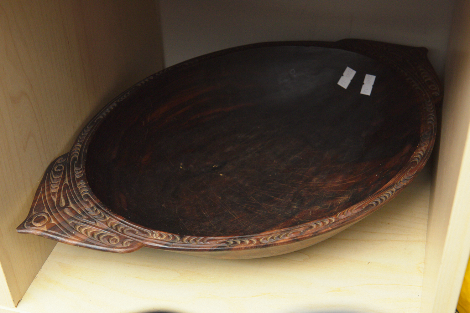 A WOODEN FOOD BOWL WITH CARVED ORNAMENTATION