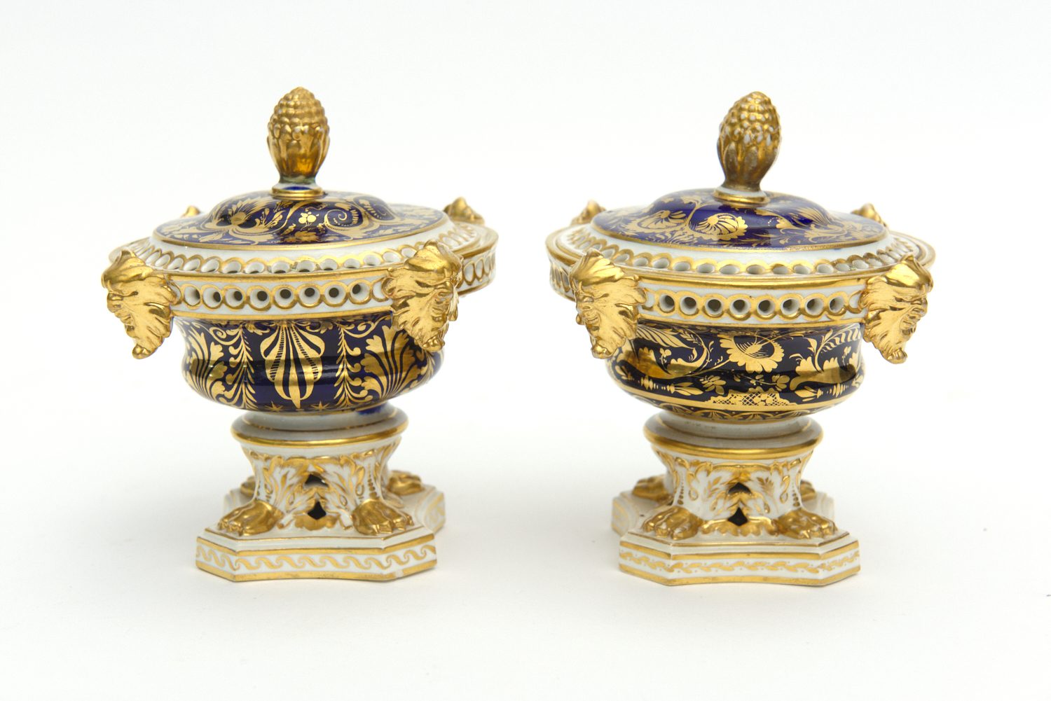 A PAIR OF DERBY PORCELAIN LIDDED POT POURRI VASES (BOTH FINIALS REPAIRED), 14 CM HIGH
