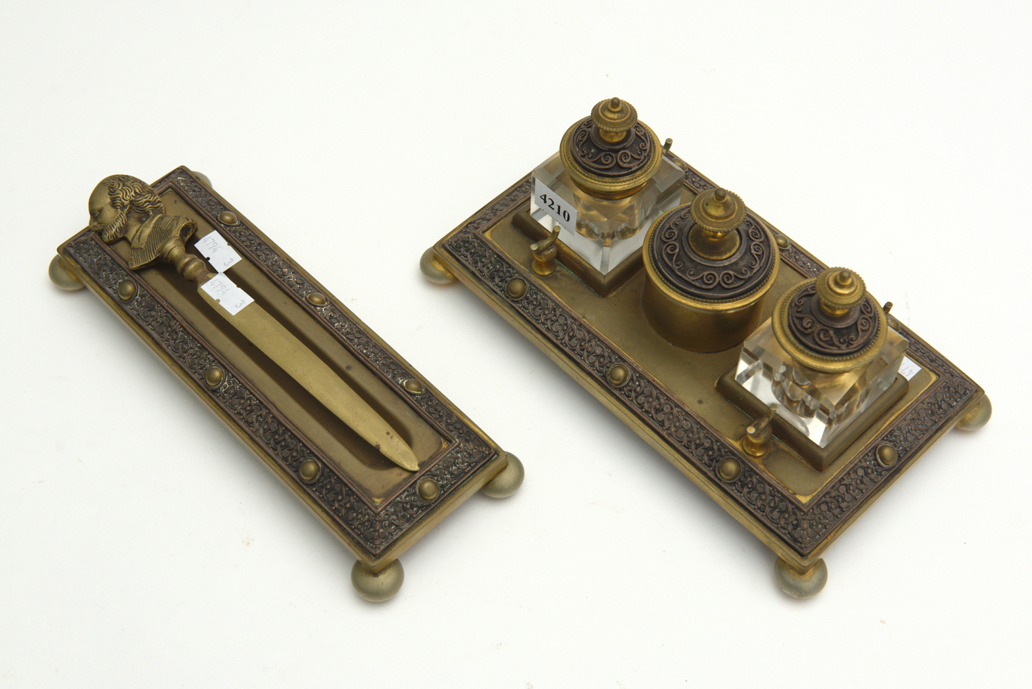 A FRENCH EMPIRE STYLE INK STAND, PEN TRAY AND LETTER OPENER