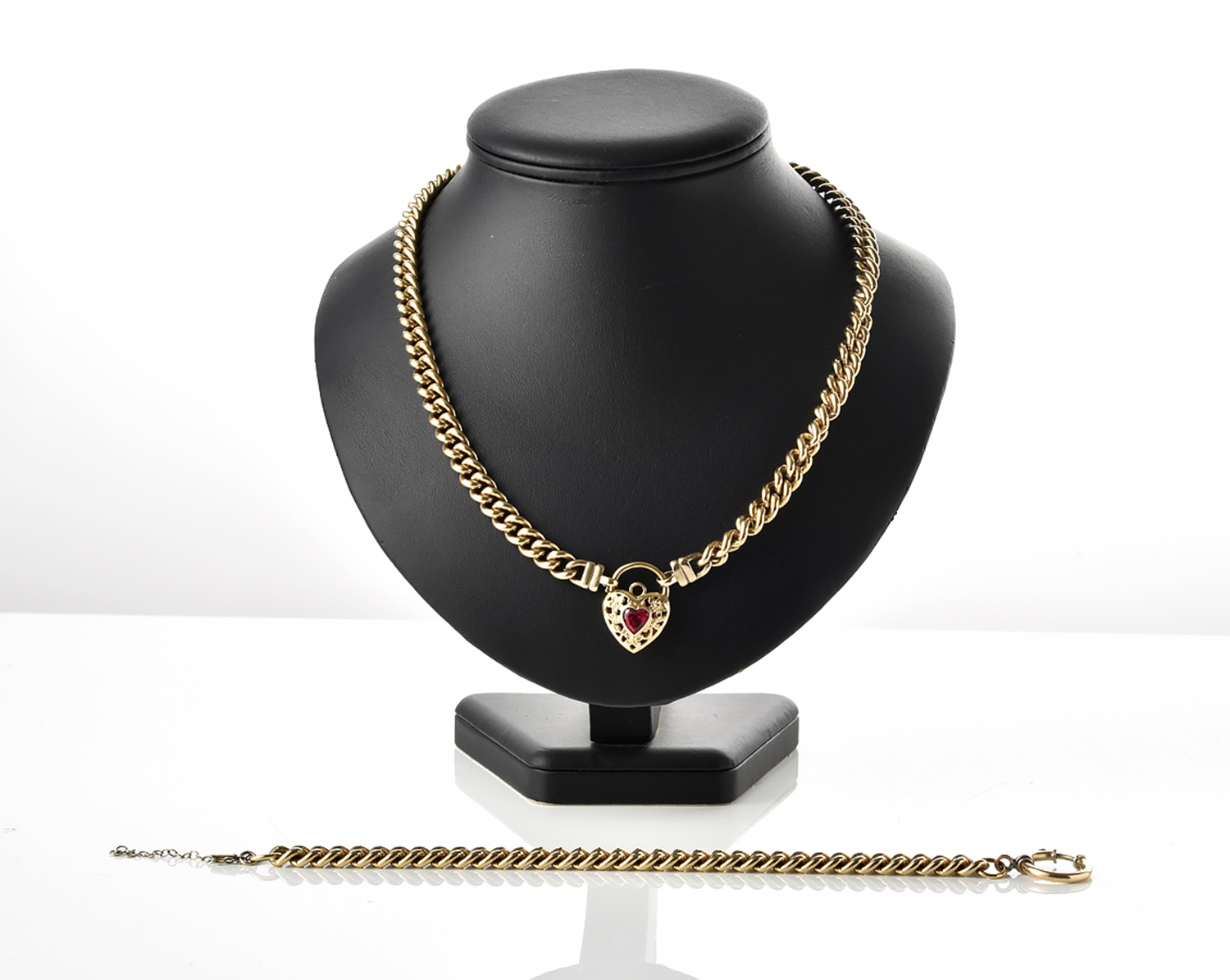 AN 18CT GOLD LINED NECKLACE, LENGTH 52CM AND BRACELET, LENGTH 23CM, WITH A PASTE SET HEART PADLOCK