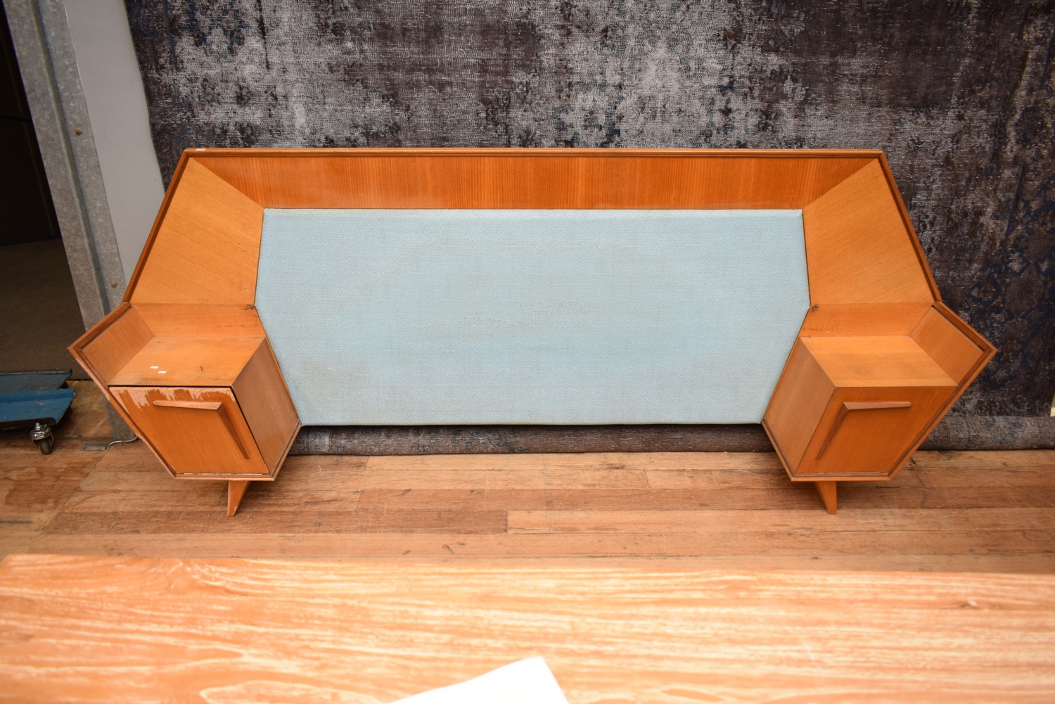 A MID-CENTURY BEDHEAD WITH ATTATCHED BEDSIDES (A/F) (106H X 254W X 36D CM)