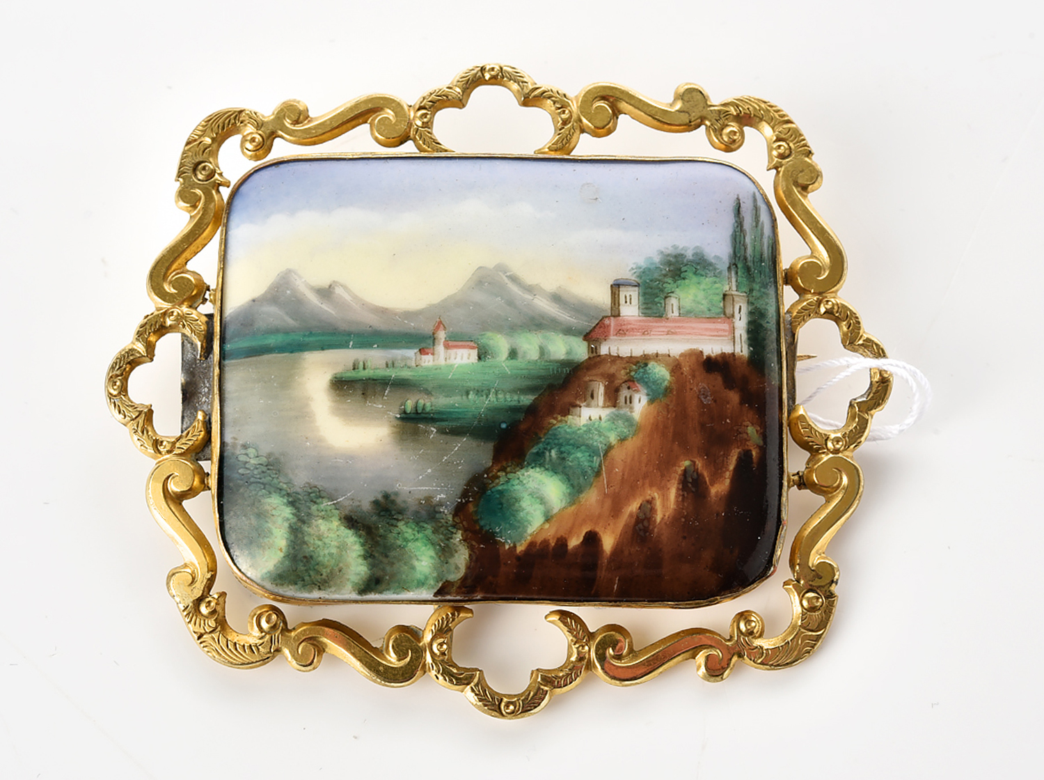 A HAND PAINTED PORCELAIN BROOCH DEPICTING AN EUROPEAN LANDSCAPE, TO A PINCHBECK FRAME, 65x55MM