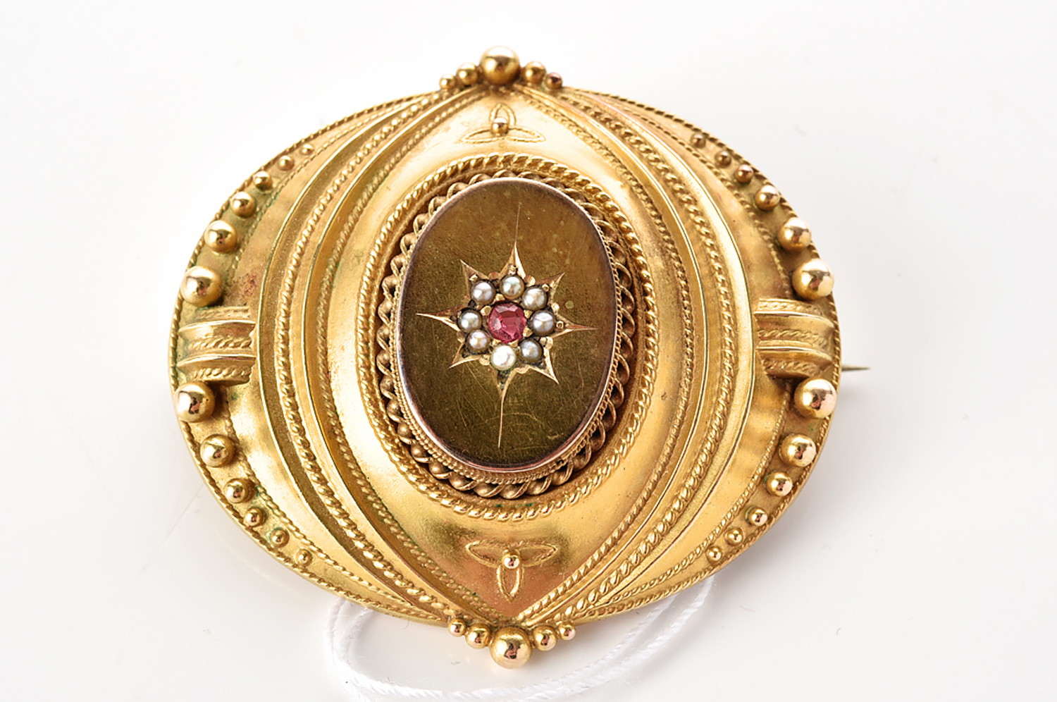 A VICTORIAN SEED PEARL AND RED PASTE SET BROOCH IN 15CT GOLD, 42x40MM, 7.3GMS